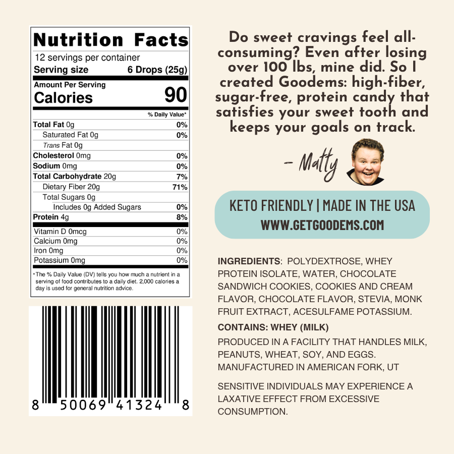 Our newest Good For You Candy flavor, Cookies & Cream, blends creamy vanilla sweetness with rich cocoa notes for the perfect bite-sized treat. These candy drops are sugar-free, packed with 20g of fiber and 4g of protein per serving, and naturally sweetened for a smooth, satisfying taste that quiets food noise and keeps you fuller, longer.
