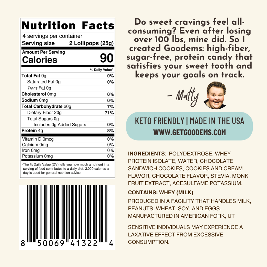 Enjoy the classic flavor of cookies & cream in a lollipop that actually loves you back. These protein suckers are sugar-free, high in fiber, and made with natural sweeteners—so you can stay full and snack less. Perfect for a sweet pick-me-up at work, in the car, or on the go.